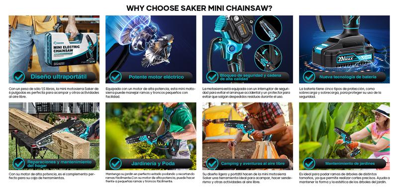 【FUERTE SISTEMA DINÁMICO】Las mini motosierras Saker están fabricadas con cadenas de guía de alta calidad que han sido sometidas a un proceso de enfriamiento profundo para garantizar un corte suave. Además, se utiliza un motor de cobre puro, que es muy potente. Corte más eficiente y más rápido.