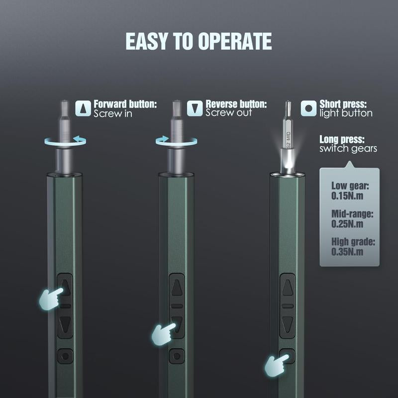 • 【Power & Precision in Your Palm】Imagine a precision screwdriver that delivers 200 RPM of pure power, with adjustable electric torque from 0.15 - 0.35 N.m and manual torque of >5N.m. That's efficiency like never before! Flip between modes effortlessly for superior control - it's like having two tools in one. With two speed gears, say goodbye to over-torque damage. This is more than just a screwdriver, it's your ultimate precision tool for all tasks!