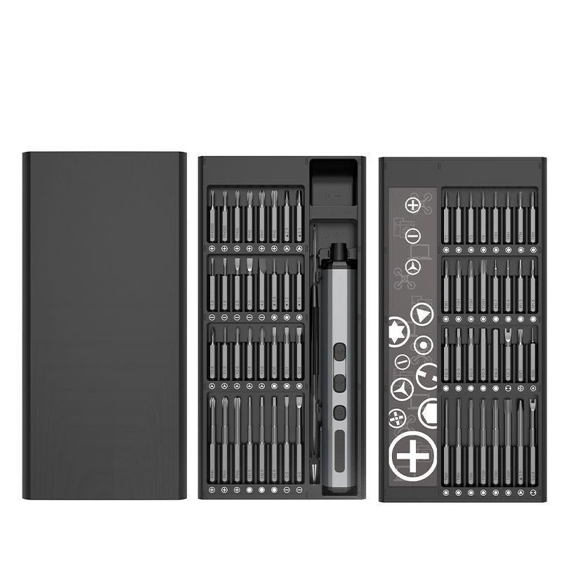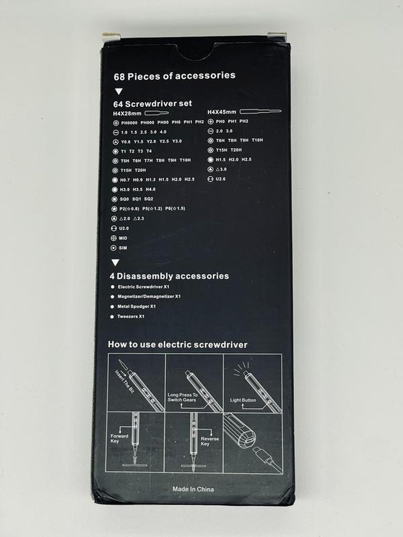 • 【68-in-1 Elite Precision Screwdriver Set】This comprehensive set includes 1 electric screwdriver, 64 screw bits, 1 mini magnetic mat, 4 handling tools (1 metal and 3 plastic), 1 pair of tweezers, 1 suction cup, 1 removal tool, 1 magnetizer/demagnetizer and a USB charging cable. A truly versatile and convenient toolkit for all your DIY needs!